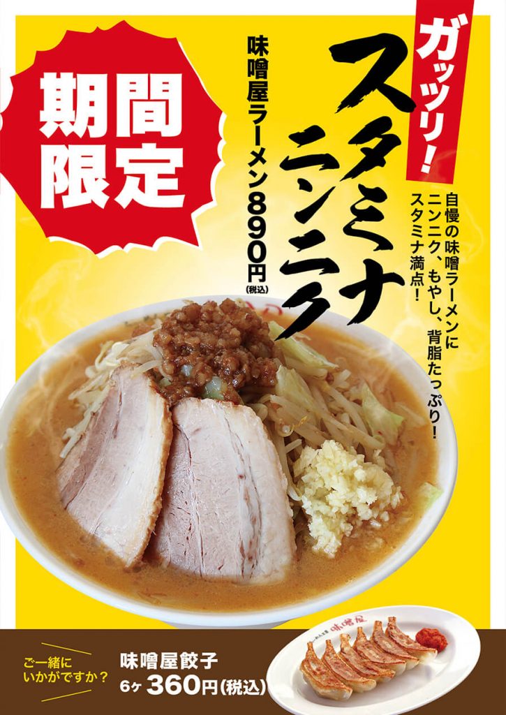 2025年11月5日 / 最終更新日時 : 2025年11月4日 misoya_webmaster お知らせ 【期間限定】スタミナニンニク味噌屋ラーメンの販売を開始いたしました。 11/5(水)より期間限定で毎回人気のスタミナニンニク味噌屋ラーメンの販売を開始いたします!ニンニク、もやし、背脂ガッツリ!スタミナ満点!是非ご賞味ください。